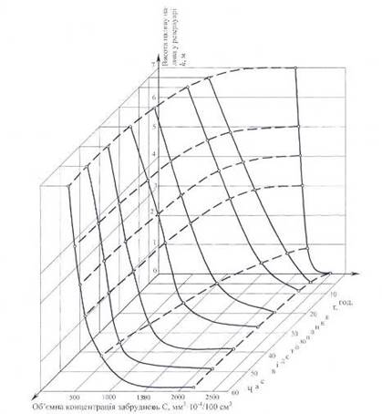 Розподілення забруднень палива по висоті резервуару в залежності від тривалості відстоювання, представлено на рис. 3.5. Ці дані повністю відповідають встановленим раніше закономірностям процесу відстоювання палива, що знаходиться в резервуарі. Із приведеної тримірної залежності видно, що найбільш ефективно паливо очищується в початковий період відстоювання, при чому найбільш ефективно цей процес протікає в верхній шарах палива.