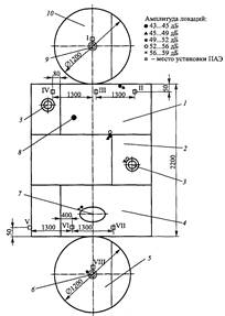 Рисунок 2 - Схема расположения источников АЭ на развертке сосуда и местоположение зарегистрированных дефектов:1 — обечайка 1; 2 — обечайка 2; 3 — вход воздуха; 4 — обечайка 3; 5 — днище нижнее; 6 — штуцер слива конденсатора; 7 — лазовое отверстие; 8 — штуцер манометра; 9 — штуцер предохранительного клапана; 10 — днище верхнее; I—VIII — номера приемников АЭ