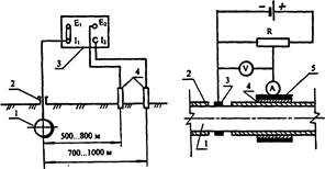 Проще всего определить переходное сопротивление Rn в местах установки контрольно-измерительных колонок (КИК). В этом случае используется схема измерения, изображенная на рис. 5.5. В качестве источника тока и одновременно измерительного прибора используются измерители сопротивления МС-08, М-231 и др. Значение переходного сопротивления снимают непосредственно по шкале прибора. Однако возможности данного метода ограничены, поскольку КИК размещаются по трассе трубопровода через 1 км.