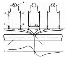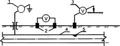 Рисунок 8 - Локализация сквозных дефектов защитного покрытия путем измерения градиента постоянного тока:1 — труба; 2 — медно-сульфатный электрод; 3 — удлинительные штанги; 4 — высокоомный вольтметр; 5 — дефект защитного покрытия