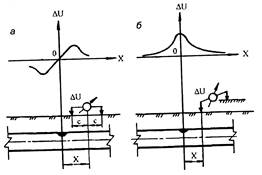 Минимальный (нулевой) потенциал наблюдается, когда центр двухэлектродной установки находится под сквозным повреждением изоляции. Этот характер изменения разности потенциалов используется для точного определения сквозного повреждения в изоляции. Для уточнения места повреждения двухэлектродную установку располагают перпендикулярно оси трубопровода и постепенным перемещением электродов находят максимум разности потенциалов (рис. 6).