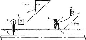 Рисунок 7 - Обнаружение сквозных дефектов изоляционного покрытия методом Пирсона с помощью прибора ИПИ:1 — труба; 2 — КИП; 3 — генератор звуковой частоты; 4 — временный заземли-тель; 5 — головные телефоны; б — приемник ИПИ; 7 — стальные электроды