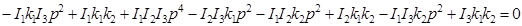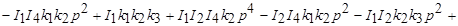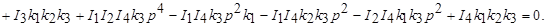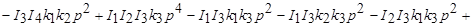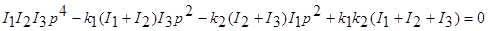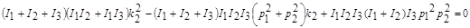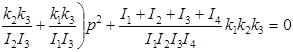 > t2:=p^6-(k1*(i1+i2)/(i1*i2)+k2*(i2+i3)/(i2*i3)+k3*(i3+i4)/(i3*i4))*p^4+(k1*k2*(i1+i2+i3)/(i1*i2*i3)+k2*k3*(i2+i3+i4)/(i2*i3*i4)+k1*k3*(i1+i3+i4)/(i1*i3*i4))*p^2+k1*k2*k3(i1+i2+i3+i4)/(i1*i2*i3*i4)=0;