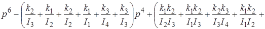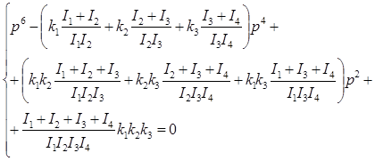 > t1:=p^6-(k1*(i1+i2)/(i1*i2)+k2*(i2+i3)/(i2*i3)+k3*(i3+i4)/(i3*i4))*p^4+(k1*k2*(i1+i2+i3)/(i1*i2*i3)+k2*k3*(i2+i3+i4)/(i2*i3*i4)+k1*k3*(i1+i3+i4)/(i1*i3*i4))*p^2+k1*k2*k3(i1+i2+i3+i4)/(i1*i2*i3*i4)=0;