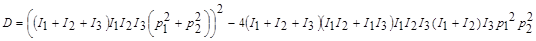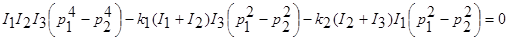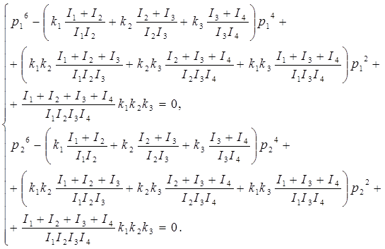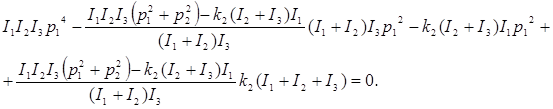 > t1:=p^4-(k1*(i1+i2)/(i1*i2)+k2*(i2+i3)/(i2*i3))*p^2+k1*k2*(i1+i2+i3)/(i1*i2*i3)=0;