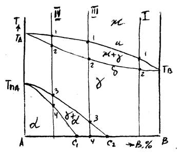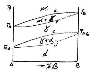 Рисунок 3. Диаграмма состояния с полиморфным превращением у двух компонентов: ТА а ТВ – линия ликвидус, ТА б ТВ – линия солидус, ТпА с ТпВ – линия начала полиморфного превращения γ↔α, ТпА d ТпВ – линия оканчания полиморфного превращения γ↔α