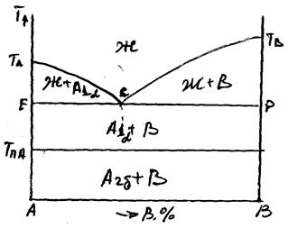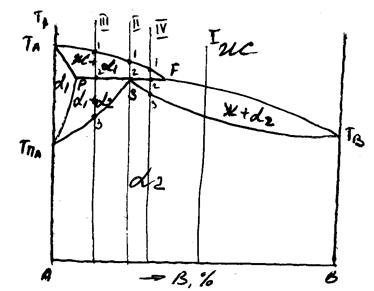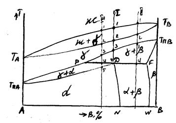 Рисунок 6. Диаграмма состояния с полиморфным превращением у одного из компонентов и с перитектическим превращением: ТА