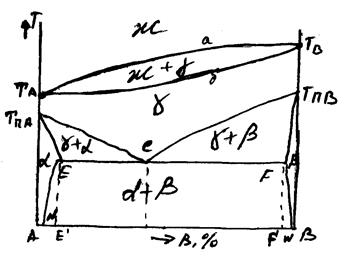 Рисунок 4. Диаграмма состояния с полиморфным превращением у одного из компонентов и с эвтектическим превращением: ТА
