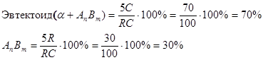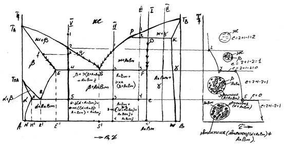 Ниже точки 4 жидкая фаза претерпевает эвтектическое превращение с образованием эвтектики: ЖS ↔ α + Аn Вm , таким образом, ЖS = э (β + Аn Вm ) = 33% (см. выше); β-фаза до и после превращения = 67%.