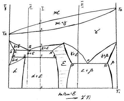 Сплав проходящий через точку D претерпевает чисто перитектическое превращение с образованием нестойкого химического соединения Аn Вm .