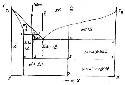 Структура сплава в интервале 4 – 5: β + эвт-ка (β + Аn Вm ) + Аn ВmII .