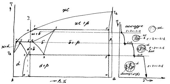 Ниже т. а – начало кристаллизации, из Ж выделяются кристаллы δ-фазы.