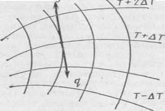 Таким образом, можно считать, что изотермические поверхности разделяют твердое тело на тонкие «слои» — изотермические оболочки, отделяющие часть тела с температурой, большей, чем T=С, от части тела с температурой, меньшей, чем Т=С. Пересечение изотермических поверхностей плоскостью дает на этой плоскости семейство изотерм (линии, соответствующие одинаковой температуре). Они обладают теми же свойствами, что и изотермические поверхности, т. е. не пересекаются, не обрываются внутри тела, оканчиваются на поверхности либо целиком располагаются внутри самого тела. На рис. 2.1 представлен участок двумерного температурного поля с изотермами Т, Т±∆Т, Т±2∆Т и т. д.