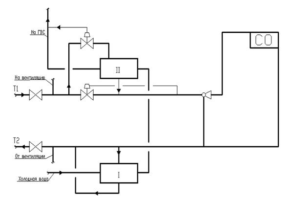 Схема подключения водоподогревателя ГВС –смешанная.