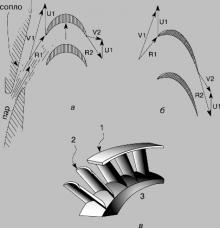 R1; в – облопачивание рабочего колеса. V1 – скорость пара на выходе из сопла; V2 – скорость пара за рабочим колесом в неподвижной системе координат; U1 – окружная скорость лопатки; R1 – скорость пара на входе в рабочее колесо в относительном движении; R2 – скорость пара на выходе из рабочего колеса в относительном движении. 1 – бандаж; 2 – лопатка; 3 – ротор." title="Рис. 1. РАБОЧИЕ ЛОПАТКИ ТУРБИНЫ. а – активное рабочее колесо, R1 = R2; б – реактивное рабочее колесо, R2 > R1; в – облопачивание рабочего колеса. V1 – скорость пара на выходе из сопла; V2 – скорость пара за рабочим колесом в неподвижной системе координат; U1 – окружная скорость лопатки; R1 – скорость пара на входе в рабочее колесо в относительном движении; R2 – скорость пара на выходе из рабочего колеса в относительном движении. 1 – бандаж; 2 – лопатка; 3 – ротор.">Рис. 1. РАБОЧИЕ ЛОПАТКИ ТУРБИНЫ. а – активное рабочее колесо, R1 = R2; б – реактивное рабочее колесо, R2 > R1; в – облопачивание рабочего колеса. V1 – скорость пара на выходе из сопла; V2 – скорость пара за рабочим колесом в неподвижной системе координат; U1 – окружная скорость лопатки; R1 – скорость пара на входе в рабочее колесо в относительном движении; R2 – скорость пара на выходе из рабочего колеса в относительном движении. 1 – бандаж; 2 – лопатка; 3 – ротор.