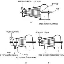 Пар на выходе из турбины обладает еще значительной тепловой энергией, которая обычно рассеивается в конденсаторе. Часть энергии может быть отобрана при конденсации отработанного пара. Некоторая часть пара может быть отобрана на промежуточных ступенях турбины (рис. 2,в ) и использована для предварительного подогрева, например, питательной воды или для каких-либо технологических процессов.