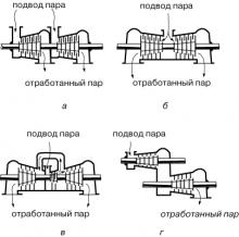 В турбине происходит расширение рабочего тела, поэтому для пропуска возросшего объемного расхода последние ступени (низкого давления) должны иметь больший диаметр. Увеличение диаметра ограничивается допустимыми максимальными напряжениями, обусловленными центробежными нагрузками при повышенной температуре. В турбинах с разветвлением потока (рис. 3) пар проходит через разные турбины или разные ступени турбины.