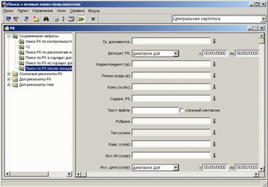 Система предоставляет широкие поисковые возможности для быстрого и удобного получения любой информации, накопленной и сохраненной в базе данных. Она позволяет мгновенно находить документы, поручения и проекты документов по значению любых реквизитов и их произвольному сочетанию. Также возможен полнотекстовый поиск по содержанию файлов, прикрепленных к регистрационным карточкам. Пользователям доступно создание поисковых запросов любой сложности и их сохранение для последующего многократного использования. Поисковый запрос может быть сформирован как «с нуля», так и на основе ранее созданного шаблона. В одном запросе могут сочетаться различные виды поиска: на точное совпадение, по различным диапазонам значений и др.