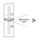 Для правильного определения объема мерную посуду следует располагать так, что нижний мениск жидкости был на уровне взгляда (см рис). Для приготовления раствора известного объема жидкость следует приливать до момента совмещения нижнего мениска с нужной отметкой. В случае непрозрачных жидкостей определение объема ведется по верхнему мениску. Следует также отметить, что наличие мениска характерно только для узких каналов.