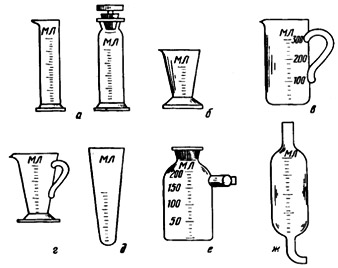 а — мерные цилинды; б — мензурка; в,г — кружки; д — конус Имгоффа; е — мерная склянка для вакуумного фильтрования; ж — мерный баллон