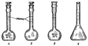 Колба с градуированным горлом (рис.1,3, г) удобна для приготовления растворов двух жидкостей с точно известными объемами, когда надо измерить уменьшение или увеличение общего объема смеси жидкостей после их растворения.