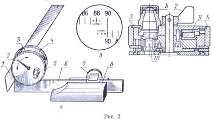 Оптический угломер (рис. 1.2) имеет цилиндрический корпус, которым жестко скреплена основная линейка 6 со сквозным продольным пазом. Сменная линейка / может поворачиваться относительно основной и перемещаться в продольном направлении. При больших углах поворота конец сменной линейки входит в паз основной. На верхней крышке 3 установлена отсчетная лупа 5 увеличением 16х. Линейка / может быть зафиксирована в продольном направлении поворотом рычага 2. Установленный угол этой линейки фиксируется поворотом кольца 4 с накаткой. Прилагаемая к угломеру съемная подставка <S, фиксируемая винтом 7, имеет плоскую и призматическую рабочие поверхности. Шкала угломера нанесена на стеклянной пластине 9 и состоит из четырех секторов по 90° с ценой деления 1°. На стекле другой стеклянной пластины 10 нанесены прямая и обратная минутные шкалы с ценой деления 5'. В поле зрения лупы 5 одновременно видны обе минутные шкалы и часть градусной шкалы. Целое число градусов отсчитывают по делению шкалы, находящемуся в пределах минутной шкалы, минуты отсчитывают по минутной шкале относительно градусной шкалы. На рис. 2, б показано поле зрения окуляра.