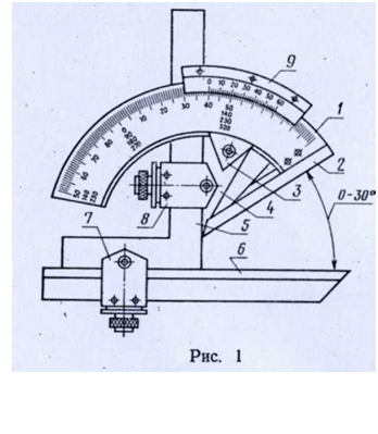 Угломер типа УН (рис. 1) состоит из основания / с градусной шкалой, на которой закреплена линейка 2. По основанию перемещается сектор 4 с нониусом 9 и стопором 3. К сектору съемной державкой 8 крепится угольник 5, к которому державкой 7 присоединена съемная линейка 6. Так можно измерить углы от 0 до 50°. Для измерения углов от 50 до 140° угольник 5 снимают и вместо него в державку 8 вставляют линейку 6. При измерении углов от 140 до 230° в державку 8 устанавливают угольник 5 со снятой державкой 7 и без линейки.