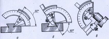 Измерение углов угломером типа УН показано на рис..А (рис. 3, а —измерение внутреннего угла; рис. 3, б, в —измерение наружных углов).
