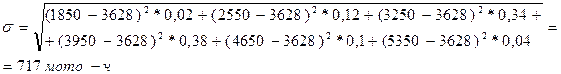 1850*0,02+2550*0,12+3250*0,34+3950*0,38+4650*0,1+5350*0,04=3628 мото-ч