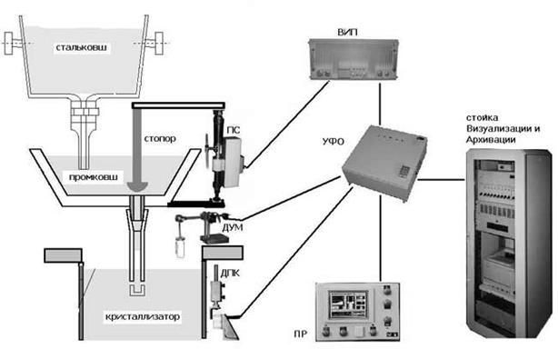 На рис. 1 схематично показана часть технологической линии разливки металла от промежуточного ковша до тянущей клети. Жидкий металл, находящийся в промежуточном ковше, под действием силы тяжести вытекает через стакан в ковше и попадает в кристаллизатор, где начинаются кристаллизация и образование слитка.