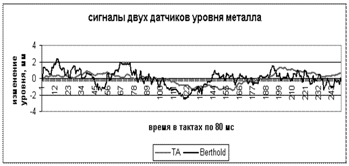 Стандартное отклонение уровня металла в кристаллизаторе, измеренное электромагнитным датчиком уровня, на указанном временном интервале менее 1 мм. Аналогичный параметр сигнала радиоизотопного датчика на том же временном интервале немного превышает 2 мм.