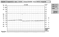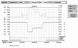 На рисунках 5 и 6 представлены фрагменты архивов работы системы с бортовым датчиком. На рисунке 6 показан момент замены погружного разливочного стакана с уменьшением скорости разливки.