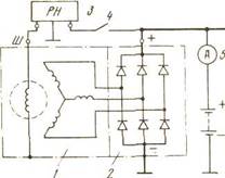 Рис. 1. Схема соединений генераторной установки переменного тока с амперметром дя контроля заряда аккумуляторной батареи: 1 - генератор: 2 - выпрямительное устройство; 3 - регулирующее устройство: 4 - выключатель зажигания; 5 – амп- ерметр; Ш - вывод обмотки возбуждения: плюсовой вывод выпрямителя |