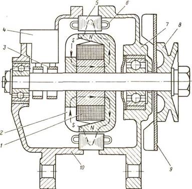 Электродвижущая сила в фазных обмотках генератора возникает при пересечении проводников обмотки статора магнитным потоком, созданным обмоткой возбуждения. При замыкании выключателя зажигания ток от аккумуляторной батареи поступает в обмотку возбуждения генератора. Вокруг обмотки возбуждения 2 возникает магнитный поток (рис. 10), рабочая часть 7 которого проходит через втулку 1 и вал, распределяется по клювообразным полюсам 3