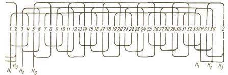 Поскольку схема соединения катушек между собой не зависит от числа витков в катушке, то все катушки изображены одновитковыми. Начала и концы всех трех фаз обмотки статора обозначены соответственно буквами Н