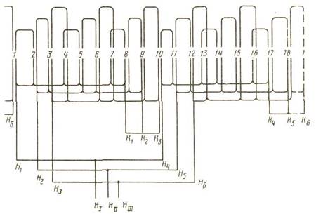 Н1, Н2, Н3; К1 К2, К3 — начало и концы фаз первой звезды;