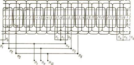 При соединении в двойную «звезду» каждая фаза состоит из двух параллельных ветвей, в каждой ветви по три непрерывно намотанных катушки (рис. 7).