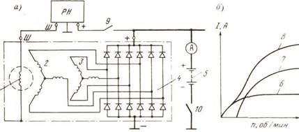 1 — обмотка возбуждения генератора; 2 — первая трехфазная обмотка статора; 3 — вторая трехфазная обмотка статора; 4 — выпрямительное устройсгво; 5 — аккумуляторная батарея; 6 — токоскоростная характеристика обмотки 2: 7 — токоскоростная характеристика обмотки 3; 8 — токоскоростная характеристика обеих обмоток генератора; 9 — выключатель зажигания; 10 — выключатель