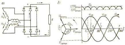 В реальных случаях вследствие падения напряжения в селеновых или кремниевых вентилях, соединительных проводах и т. п., соотношения между величинами выпрямленного и фазного напряжения и тока отличаются от приведенных выше теоретических значений и их величина обычно определяется экспериментально