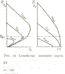 Семейство внешних характеристик, снятых по схеме независимого возбуждения, изображено на рис. 14, б. Каждая характеристика снимается при определенных значениях частоты вращения ротора генератора и напряжения постоянного тока, подводимого к обмотке возбуждения, что соответствует определенному значению тока возбуждения генератора.
