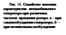Внешняя характеристика автомобильного генератора также выражается семейством кривых, соответствующих различным частотам вращения ротора генератора (рис. 14).