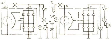 Кроме того, различают токоскоростные характеристики в так называемом «холодном» и «горячем» состоянии генератора, которые экспериментально определяют следующим образом. Генератор устанавливают на стенде, имеющем электрический двигатель для привода во вращение ротора генератора, и приборы, соединенные по схеме, приведенной на рис. 15, а или 15, б. В случае снятия характеристики по схеме рис. 15, б (независимого возбуждения) сначала включают выключатель В1 и реостатом устанавливают напряжение возбуждения, равное номинальной величине (т. е. 14 или 28 В), После этого плавно приводят во вращение ротор генератора и тахометром определяют начальную частоту вращения в режиме холостого хода, при которой выпрямленное напряжение достигает величины 14 или 28 В. Затем включают рубильник В2 и снимают характеристику, увеличивая частоту вращения и подбирая на каждой частоте вращения такое положение реостата нагрузки Rn, чтобы выпрямленное напряжение было равно номинальному напряжению 14 или 28 В. Характеристика, снятая таким образом, соответствует «холодному» состоянию.