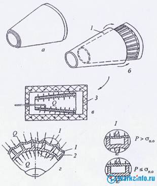 Технологическая схема диффузионной сварки: а – требуемая конструкция; б – заготовки для сварки; в – сборка; г – сварка; д – готовая конструкция; 1 – несущая обшивка; 2 – готовый заполнитель; 3 – технологические листы; 4 – мембрана.
