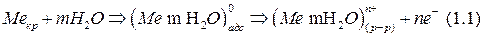 При погружении металла в раствор электролита поверхность металла адсорбирует молекулы воды. На границе фаз возникает слой, состоящий из нейтральных частиц: атомов металла и связанных с ними в комплексы молекул воды, которой в равной степени принадлежит как самому металлу, так и раствору электролита. В поверхностной фазе возможно перераспределение электронной плотности с образованием положительно заряженных ионов и электронов. В состав положительного заряженных ионов входят и частицы металлов, и молекулы воды, а заряд иона более или менее равномерно распределен по всему иону. В общем виде этот процесс можно выразить уравнением: