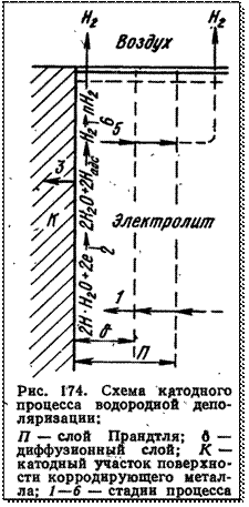 Катодный процесс водородной деполяризации в кислых средах состоит из следующих стадий (рис, 174):
