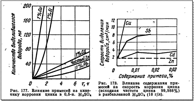 3) большая зависимость от природы и содержания катодных примесей или структурных составляющих сплава: чем ниже перенапряжение водорода на катодных примесях или структурных составляющих сплава и чем больше их содержание, тем больше скорость коррозионного процесса (рис. 177 и 178);
