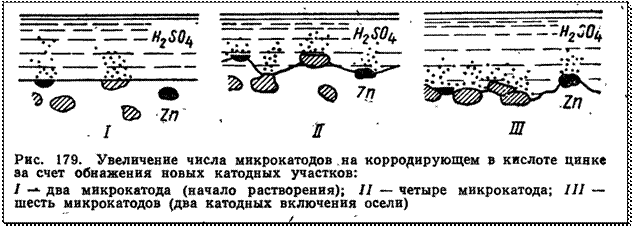 5) протекание процесса с ускорением, т. е. с увеличением скорости коррозии во времени (см. рис. 177); это связано с тем, что прохождение катодной реакции разряда водородных ионов облегчается в результате увеличения числа микрокатодов на поверхности корродирующего металла за счет обнажения новых катодных участков по мере растворения металла (рис. 179);