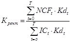 При Крент > 1 сумма дисконтных денежных доходов > суммы инвестиций. Данный коэффициент является относительным показателем, поэтому он очень удобен при выборе одного проекта из альтернативных, имеющих одинаковые значения NPV.