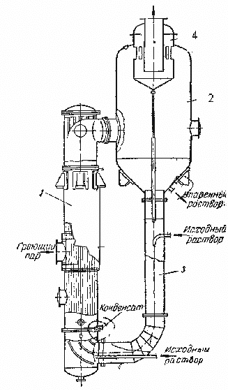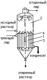 Аппарат состоит из теплообменного устройства — нагревательной (греющей) камеры 1 и сепаратора 2. Камера и сепаратор могут быть объединены в одном аппарате (рис. 1) или камера может быть вынесена и соединена с сепаратором трубами. Камера обогревается обычно водяным насыщенным паром, поступающим в ее межтрубное пространство. Конденсат отводят снизу камеры.