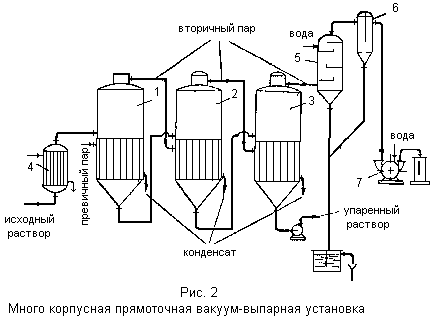 Выпаривание под атмосферным давлением, а иногда и выпаривание, под вакуумом проводят в одиночных выпарных аппаратах (однокорпусных выпарных установках). Однако наиболее распространены многокорпусные выпарные установки, состоящие из нескольких выпарных аппаратов, или корпусов, в которых вторичный пар каждого предыдущего корпуса направляется в качестве греющего в последующий корпус. При этом давление в последовательно соединенных (по ходу выпариваемого раствора) корпусах снижается таким образом, чтобы обеспечить разность температур между вторичным паром из предыдущего корпуса и раствором, кипящим в данном корпусе, т.е. создать, необходимую движущую силу процесса выпаривания. В этих установках первичным паром обогревается только первый корпус. Следовательно, в многокорпусных выпарных установках достигается значительная экономия первичного пара по равнению с однокорпусными установками той же производительности.